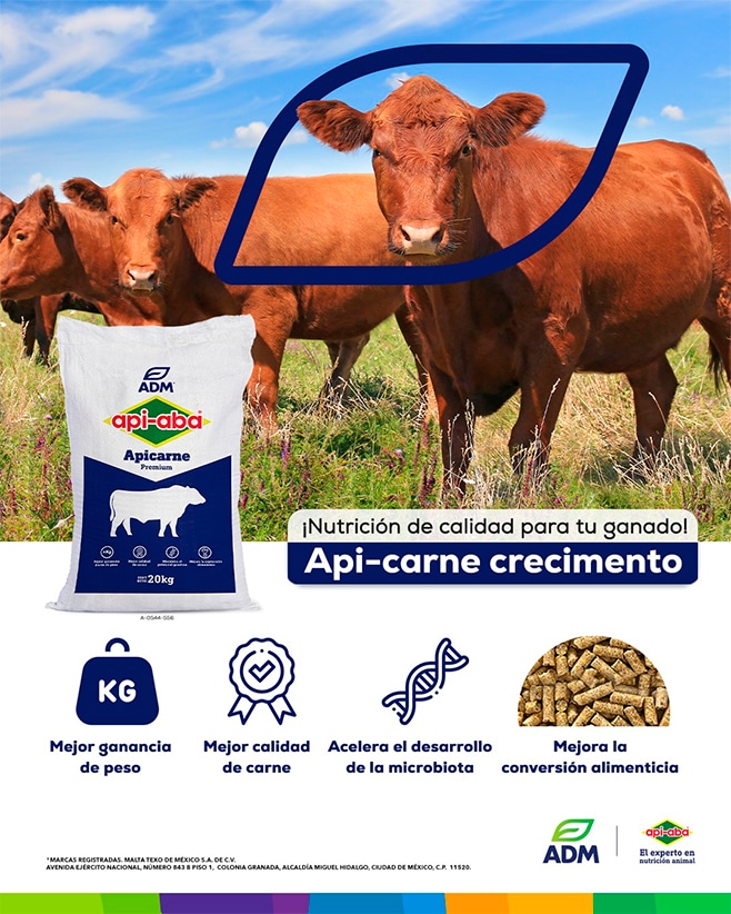 Potencia el desarrollo de tu Ganado de Carne con Api- Carne Crecimiento, el alimento balanceado de alta tecnología diseñado para la etapa de crecimiento.