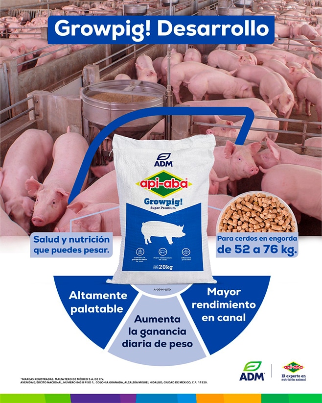 Desarrollo, el alimento balanceado de alta tecnología, medicado con flavomicina y formulado especialmente para la etapa de engorda (52 a 76 kg o de 98 a 126 días de edad).